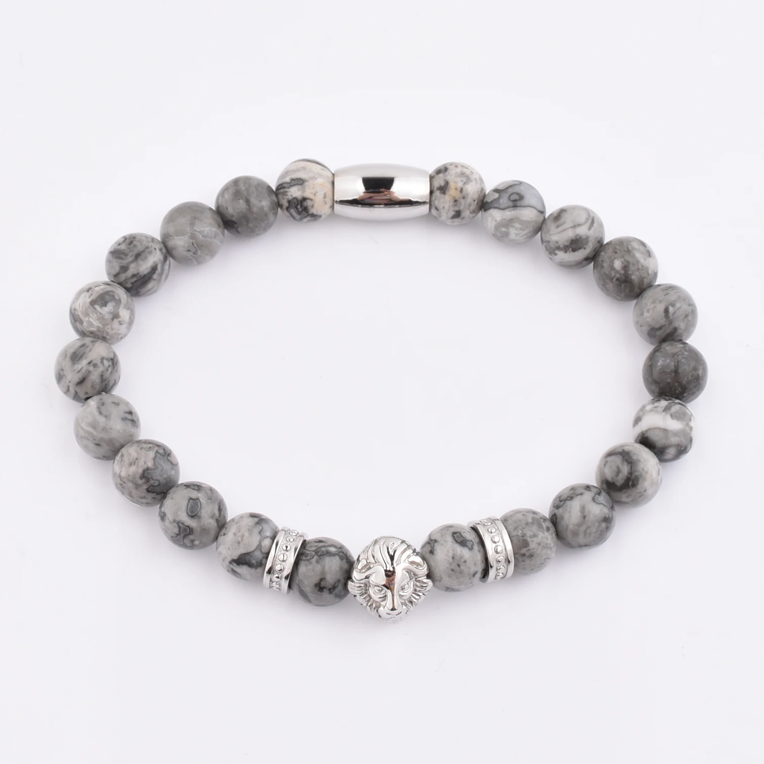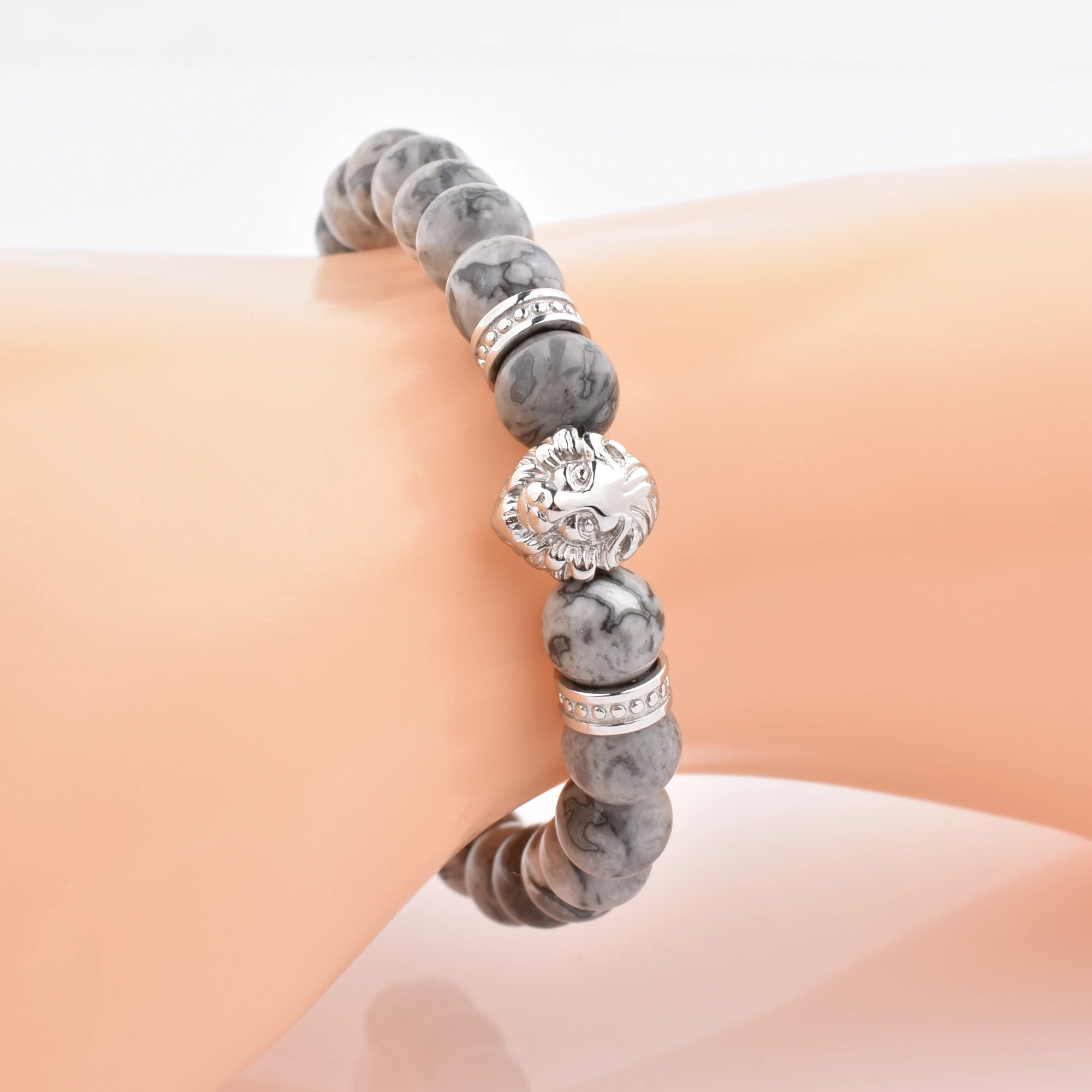 Product name | Custom Jewelry Natural Grey Jasper Gemstone 316L Stainless Steel Lion Bead Bracelet |
