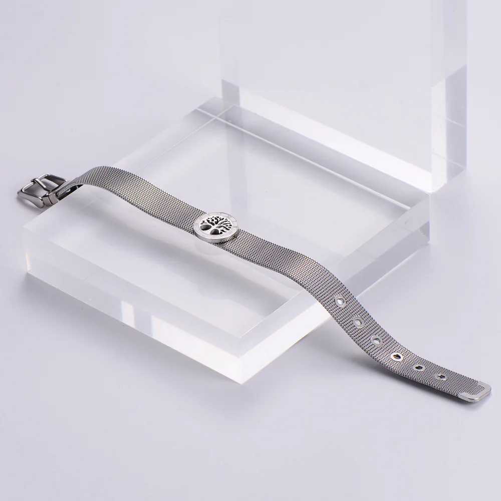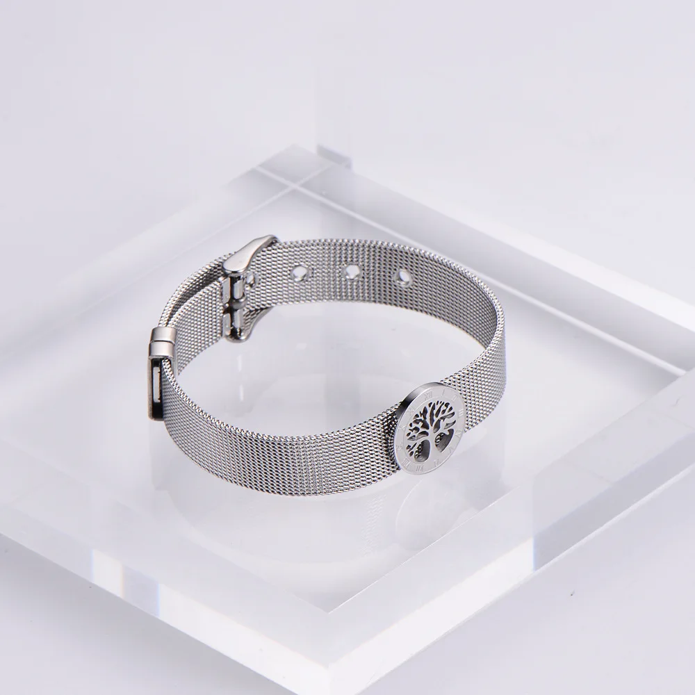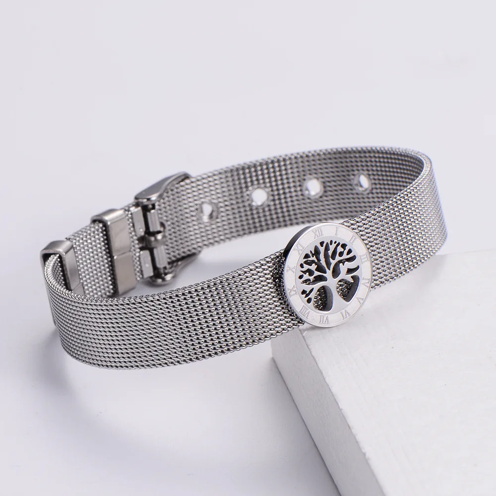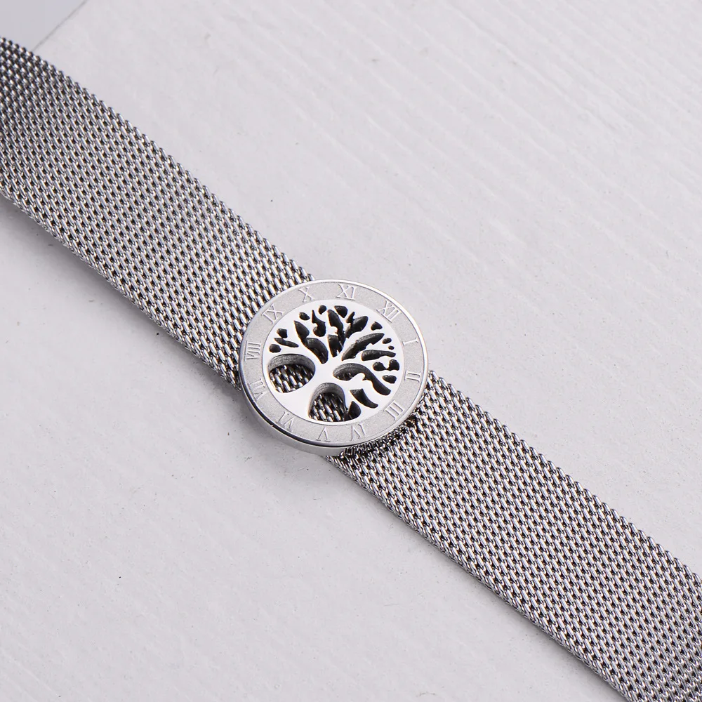Product Name | 12MM Classic Jewelry Tree Of Life Engraved Roman Numerals Round Plate Stainless Steel Milanese Mesh Strap Bracelet |