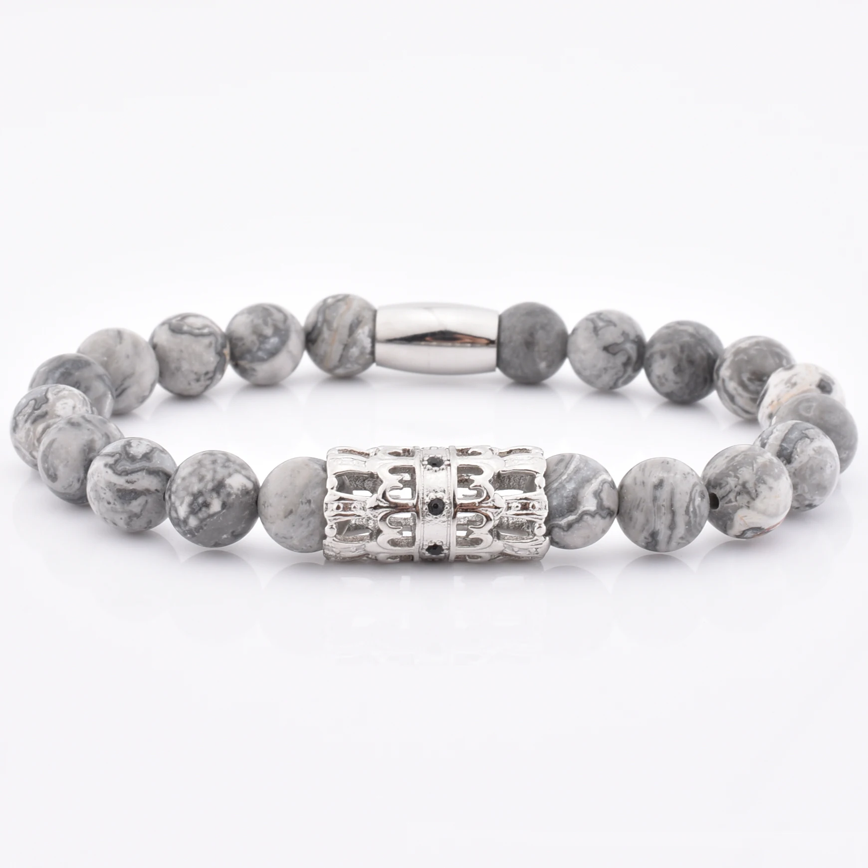 Jewelry Type | Wholesale Matt Grey Jasper Stone Custom Elastic Hot Sale Silver Charm Bead Bracelet |
